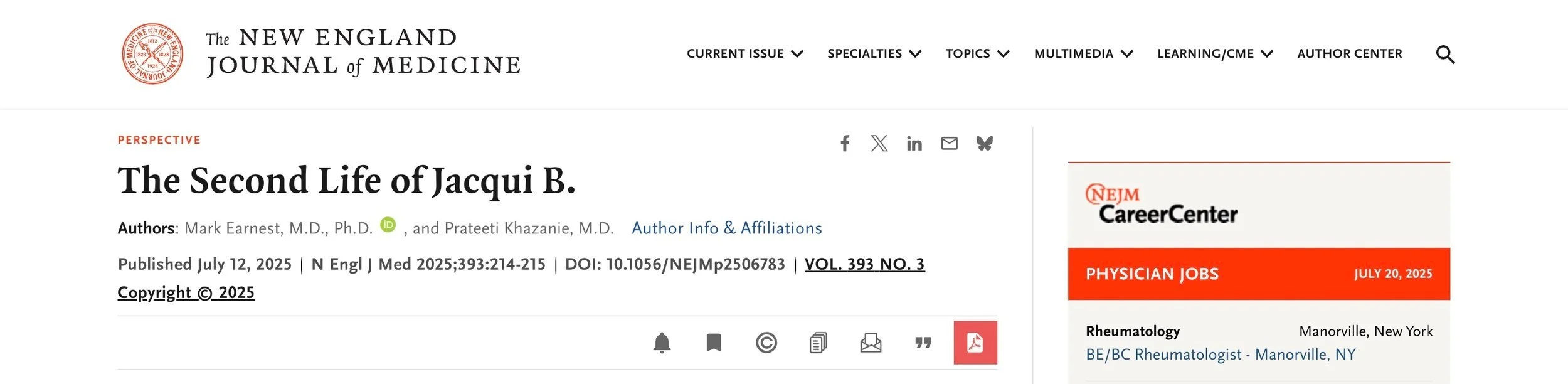 The New England Journal of Medicine published a Patient Perspective piece this year utilizing Andrea’s story (told anonymously as “The Secret Life of Jacqui B) of being a severely immunosuppressed person living at a time of unforeseen public health stupidity.